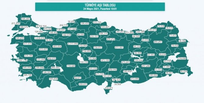 Türkiye genelinde güncel verilere 15 milyon 972 bin 828'i birinci doz, 11 milyon 936 bin 316'sı ikinci doz olmak üzere göre toplamda 27 milyon 909 bin 144 kişi aşılandı. Aydın'da ise bu rakamlar birinci doz 303 bin 386, ikinci doz 242 bin 568 olmak üzere toplamda 545 bin 954 olarak belirtildi.