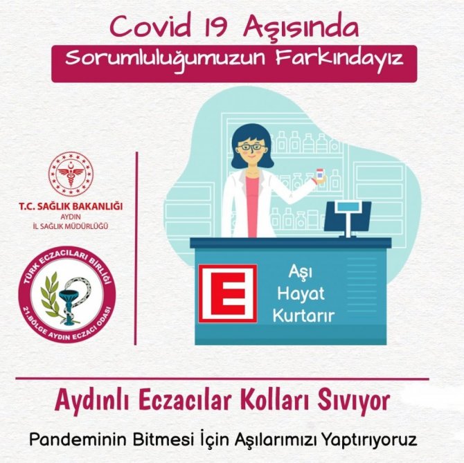 Aydın Eczacılar Odası işbirliği ile başlatılan projede ise aşı farkındalığı oluşturulacak. "Sorumluluğumuzun farkındayız" sloganı ile gerçekleştirilecek olan kampanyada Aydınlı eczacılar, pandeminin bitmesi için aşılarını yaptıracak.
