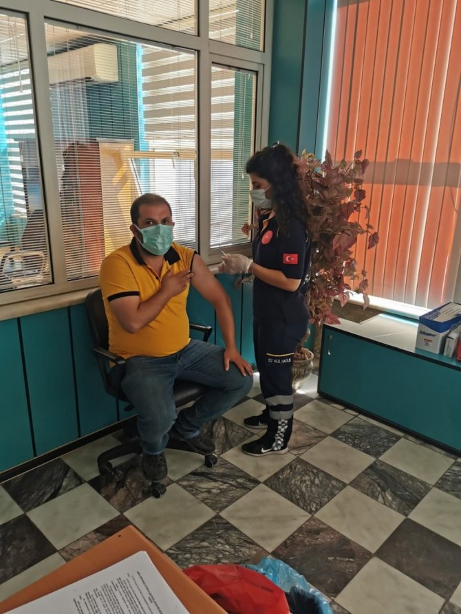 Aydın'da Korona virüs salgını ile mücadele kapsamında başlatılan aşı seferberliği kurumlarda da devam ediyor. Şoförler Odası başkanı Semih Özmeriç'in talebi üzerine odanın hizmet binasında da aşılama çalışması gerçekleştirildi. Kurum çalışanlarının yanı sıra çevredeki vatandaşlar ve odaya hizmet almaya gelen şoförler de ayaklarına gelen sağlıkçılara aşılarını yaptırdı.