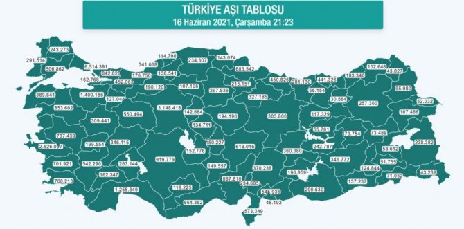 Sağlık Bakanlığı resmi internet sitesinde, 16 Haziran Çarşamba günü verilerine göre ülke genelinde toplam 37 milyon 172 bin 251 aşı yapıldı. Türkiye aşı tablosuna bakıldığında ise Aydın'da 424 bin 877 kişiye birinci doz, 277 bin 44 kişiye de ikinci doz olmak üzere toplam 701 bin 921 aşı vuruldu.