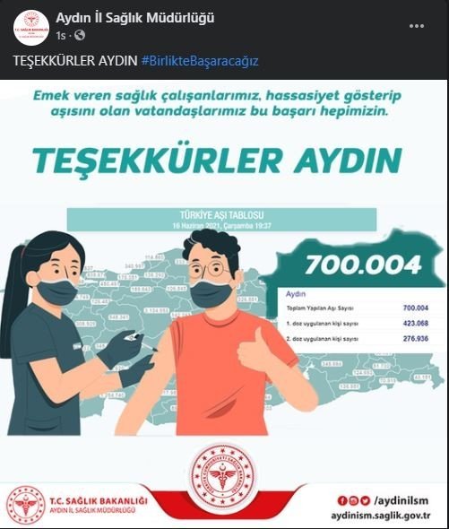 İl genelindeki aşı rakamlarının 700 binin üzerine çıkması sonrasında sosyal medya hesabından paylaşım yapan Aydın İl Sağlık Müdürlüğü, hassasiyetleri için Aydınlılara teşekkür etti.