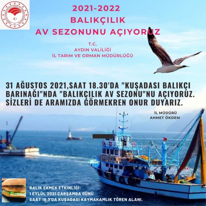 Balık avı sezonunun açılması ile birlikte düzenlenecek olan balık ekmek etkinliği de 1 Eylül Çarşamba günü saat 18.30'da Kuşadası Kaymakamlığı tören alanında gerçekleştirilecek."