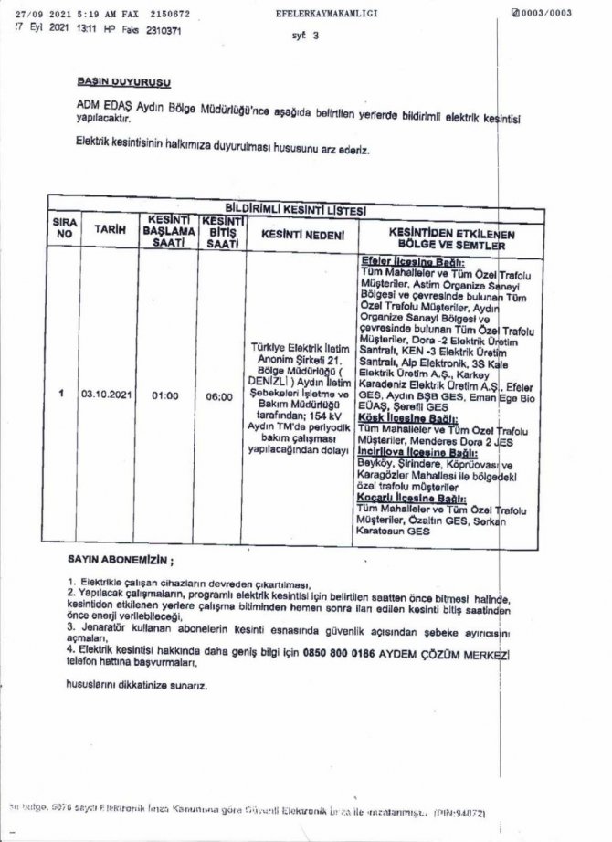 Aydın Valiliği tarafından tarafından yapılan açıklamaya göre 3 Ekim Pazar günü periyodik bakım nedeniyle Efeler, Köşk, İncirliova ve Koçarlı ilçelerinde elektrik kesintisi uygulanacak.