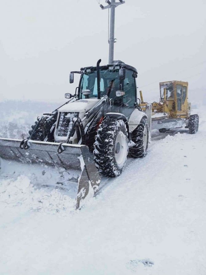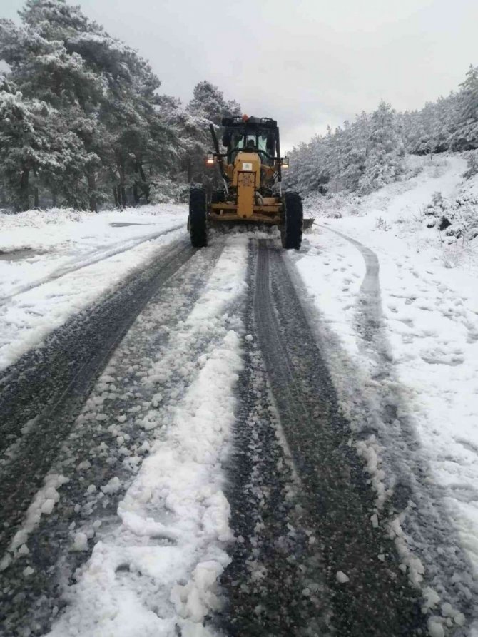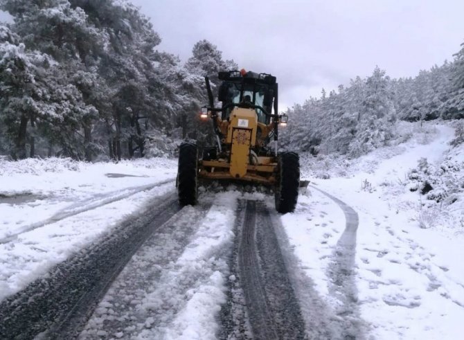 Aydın'ın yüksek kesimlerindeki mahallelerde etkili olan kar yağışının ardından Aydın Büyükşehir Belediyesi ekipleri kapanan yolları açarken, karda...