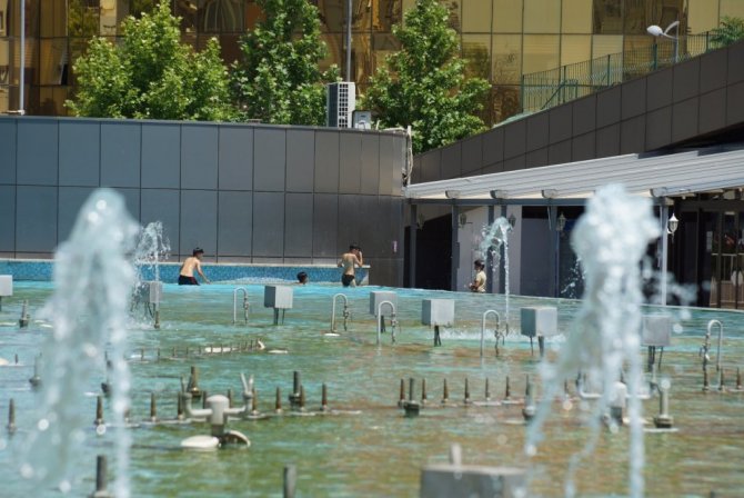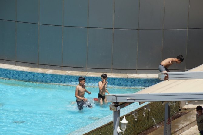 Termometrelerin 38 dereceyi gösterdiği Aydın'da sokağa çıkan vatandaşlar güneşten korunmak için gölgelik alanlara sığınırken, bazı çocukların meydandaki süs havuzuna girerek serinlemesi ise tehlike oluşturdu.