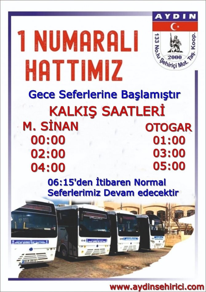 Efeler Şehiriçi Özel Halk Otobüsleri Kooperatifi'ne bağlı otobüsler gece seferlerine yeniden başladı. Bu kapsamda 1 numaralı hat otobüsleri gece yarısı dahil olmak üzere sabaha kadar 2'şer saat ara ile sefer yapacak.