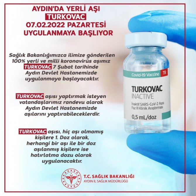Aydın'da Turkovac aşısı uygulanması ile ilgili olarak Aydın İl Sağlık Müdürlüğü'nden yapılan açıklamada, "Türk bilim insanları tarafından geliştirilen yüzde 100 yerli ve milli Korona virüs aşısı Turkovac, dünya genelinde onay almış 3'üncü aşı olarak Aydın'da da vatandaşlara uygulanmaya başlayacak. Uygulanmasına Aydın Devlet Hastanesi'nde başlanacak olan Turkovac aşısını yaptırmak isteyen vatandaşlar randevularını alarak aşılarını yaptırabilecek. Turkovac aşısı, hiç aşı olmamış kişilere 1'inci doz olarak, herhangi bir aşı ile bir doz aşılanmış kişilere ise hatırlatma dozu olarak uygulanacak" ifadelerine yer verildi.