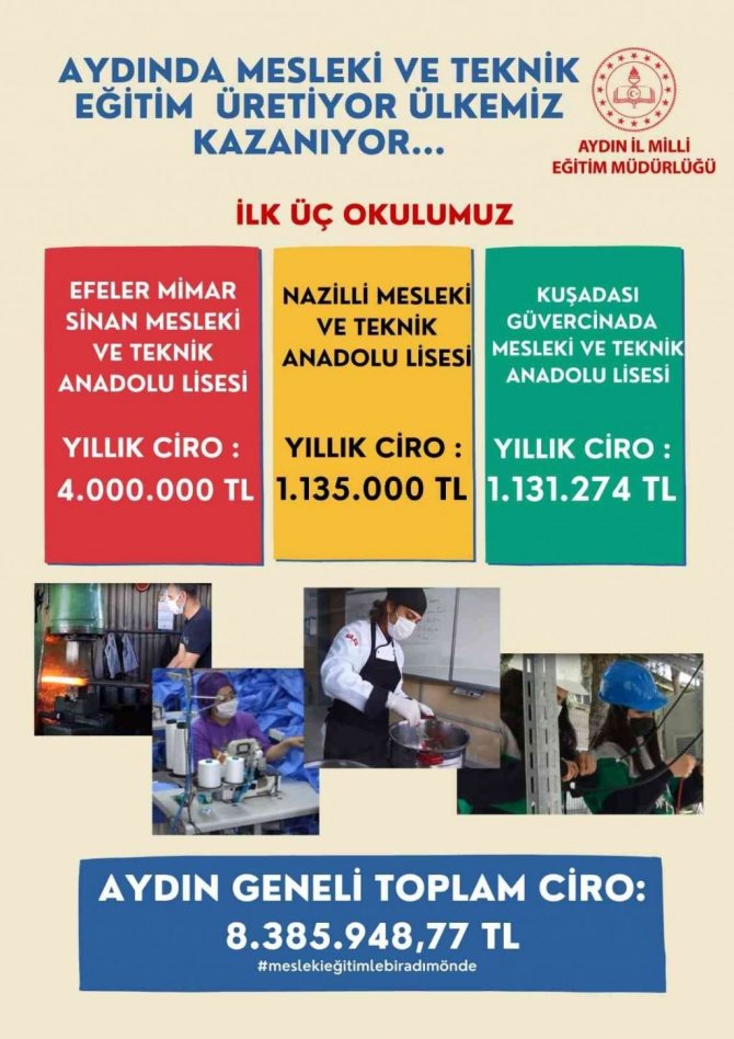 Aydın'daki Mesleki ve Teknik Anadolu Liselerinin öğrencileri, öğretmenlerinin gözetiminde okullarındaki atölyelerde ürettikleri 46 bin 500 öğrenci sırası, 850 öğretmen dolabı, 700 öğrenci dolabı ve 466 öğretmen kürsüsü, 136 bin 546 adet maske, 39,5 ton el dezenfektanı, 43 ton yüzey dezenfektanı, 24 ton sıvı sabun, 5 ton çamaşır suyu ile hem mesleki tecrübe kazanıp hem de okullarında toplam 8 Milyon 385 bin liralık gelir elde ettiler. Aynı zamanda 2020 yılında herhangi bir cirosu olmayan Efeler Mimar Sinan, Söke ve Nazilli Mesleki ve Teknik Anadolu Liselerinin bir yıl içerisindeki dönüşümleri takdir topladı.