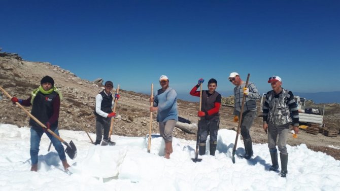 Madran Dağı'nın zirvesinde kar basım işi yapan Erkan Aktaş, "Sabah erken saatlerde yola çıkıp zirveye ulaşıyoruz. Zirvedeki karları çuvallara basıyoruz. Çuvallanan karlar buradan soğuk hava depolarına gidiyor. Oradan da kar helvası satıcılarının tezgahlarında vatandaşlarla buluşuyor. Aslı Bozdoğan'a özgü olan kar helvası yazın kavurucu sıcaklıklarında, insanlara nefes aldırıyor" dedi.