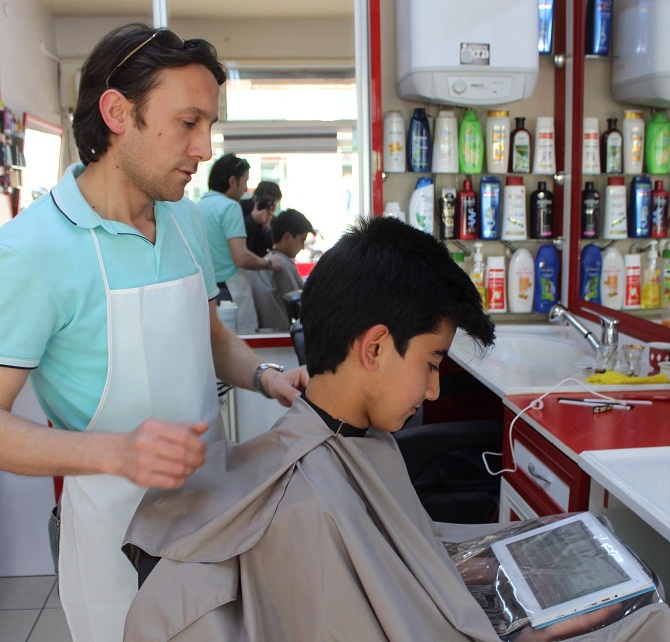 Globalleşen dünyada bilgisayar ve akıllı telefonlar hayatın her alanını sardı. Bilgisayar ve akıllı telefonlar adeta bağımlılık derecesine ulaşıp insanların ayrılmaz bir parçası haline gelince pek çok mesleğin de zorunlu malzemeleri arasında yer almaya başladı. Aydın’da bir berber makas sayısı kadar tablet alıp müşterilerine tabletle hizmet vermeye başladı.