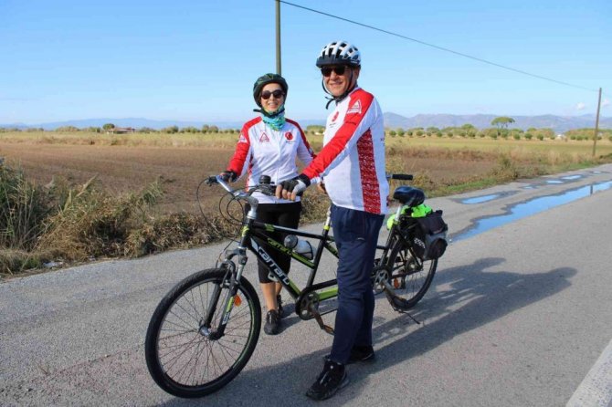 Aydın'ın Efeler ilçesinde sağlıklı yaşam için pedal çeviren bisiklet tutkunu çiftin kullandığı iki pedallı tandem bisiklet, görenlerin dikkatini çekiyor.