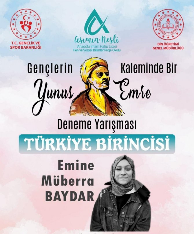 Gençlik ve Spor Bakanlığı tarafından Gençlerin Kaleminde Bir Yunus Emre Deneme Yarışması gerçekleştirildi. 13-25 yaş aralığındaki gençler katılım sağlayabildiği yarışmaya katılan Asımın Nesli Anadolu İmam Hatip Lisesi 12. sınıf öğrencisi Emine Müberra Baydar, 13-17 yaş kategorisini kazanarak Türkiye birincisi oldu. Yunus Emre ile ilgili 16 kitap okuyan ve edindiği detaylı bilgiler ile birlikte deneme yazısını kaleme alan Aydın Gençlik Merkezi gönüllüsü Müberra'yı tebrik eden Aydın Gençlik ve Spor İl Müdürü Cenap Fillikçioğlu, "Emine Müberra Baydar 1 kitap yazmış ve ikinci kitabını yazmaya devam eden, gönüllülük faaliyetleri ile gençlik merkezimizde birçok alanda çalışmalara katılan örnek bir gencimiz. Kendisini tebrik eder, ailesine ve öğretmenlerine verdikleri emekler için teşekkür ederim" diye konuştu.