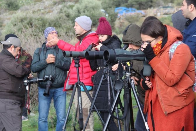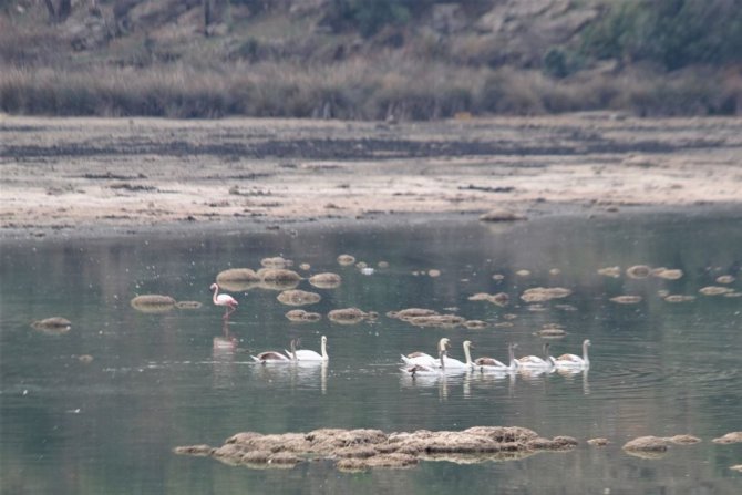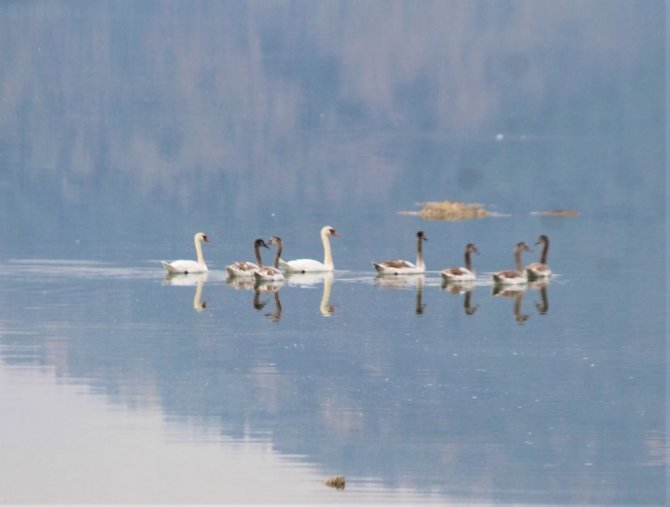 Birçok kuş türüne ev sahipliği yapan Bafa Gölü'nün durgun sularında süzülen 9 kuğu, görsel şölen oluştururken, kuş gözlemcilerini de heyecanlandırdı.