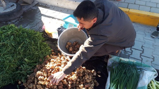 Kütahya’nın Emet ilçesinde köylüler, toprağın altında yetiştirdikleri kış sebzesi yer elmasını büyük bir incelikle ve emekle toprağın altından çıkarıp pazar tezgahında satıyorlar.