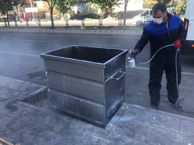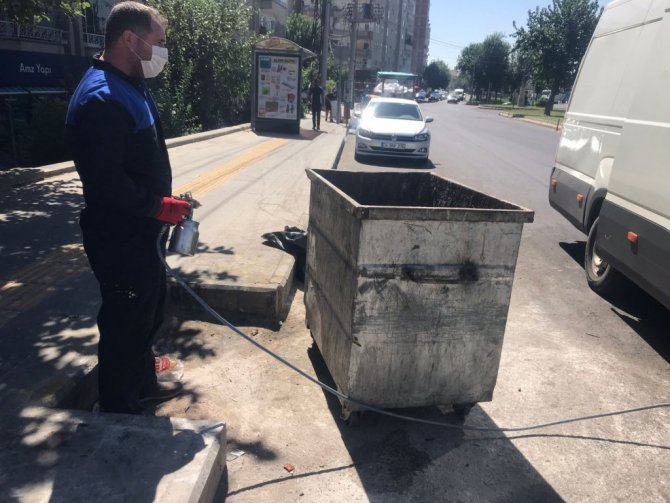 Diyarbakır'ın Bağlar ilçesinde çöp konteynerleri belediye ekipleri tarafından hastalık riskine karşı dezenfekte edilerek boyanıyor.