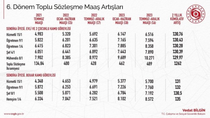 Çalışma ve Sosyal Güvenlik Bakanı Vedat Bilgin maaş artışlarına ilişkin tabloyu da paylaştı. Bilgin, "6. Dönem Toplu Sözleşmemizi az önce gece saatlerinde imzaladık. Kamu çalışanlarımız için son yıllardaki en yüksek kazanımlar, istikrarla büyümeye devam eden güçlü Türkiye'nin en önemli göstergesidir" ifadelerine yer verdi.