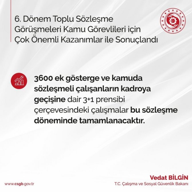 Bakan Bilgin, Kamu çalışanları için 3600 ek gösterge çalışmalarını bu sözleşme döneminde tamamlayacaklarını belirtti.