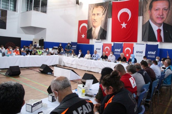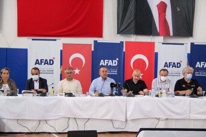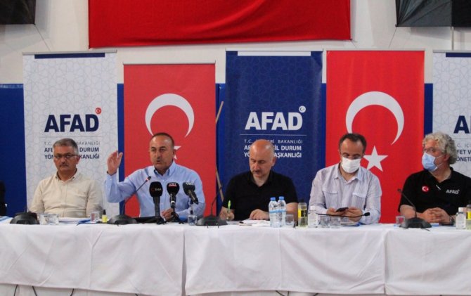 Dışişleri Bakanı Mevlüt Çavuşoğlu, Ulaştırma ve Altyapı Adil Karaismailoğlu, Antalya'nın Manavgat ilçesinde AFAD Koordinasyon Merkezi'ndeki değerlendirme toplantısı öncesi açıklamalarda bulundu. Bakan Çavuoğlu, şu anda Antalya'da 200'üncü saat içinde olduklarını belirterek, "Bugün 5 ilçede, 14 farklı noktada yangınla mücadele ediyoruz. Manavgat, Gündoğmuş, Akseki, İbradı, Alanya ilçelerinde, Gülendağ, Kızıldağ, Karaisa-Karabul arası, Karadere, Serik, Karabucak Vadisi, Sinevi Vadisi, Katrancı Dağı, Eynif Ovası, Murtiçi, Güçlüköy, Güzelbağ, Alara arası, Susuz cephelerinde çıkan orman yangınları ekiplerimizin cansiperane mücadelesiyle bazı cephelerde kontrol sağlanmış, soğutma çalışmaları başladı" ifadelerini kullandı.