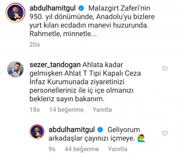 Adalet Bakanı Abdulhamit Gül, Ahlat'ta görev yapan infaz koruma memuru Sezer Tandoğan'ın sosyal medyada yaptığı davet üzerine Ahlat T Tipi Ceza İnfaz Kurumunu ziyaret etti. Malazgirt Zaferi'nin 950. yıldönümü kutlama törenine katılmak üzere Bitlis'in Ahlat ilçesine gelen Adalet Bakanı Gül, sosyal medya hesabından Selçuklu Meydan Mezarlığı'nda çektirdiği fotoğrafı paylaştı. Paylaşımı gören infaz koruma memuru Sezer Tandoğan da fotoğrafa, "Ahlat'a kadar gelişmişken Ahlat T Tipi Kapalı Ceza İnfaz Kurumuna da ziyaretlerinizi, personelleriniz ile iç içe olmanızı bekleriz Sayın Bakanım" yorumunu yaptı.