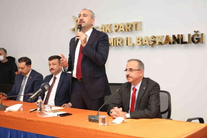 Adalet Bakanı Abdülhamit Gül, Foça'daki programının ardından AK Parti İzmir İl Başkanlığı'nı ziyaret etti. AK Parti İzmir İl Başkanı Kerem Ali Sürekli ve partililer tarafından karşılanan Bakan Gül, partililere hitap etti. Bakan Gül, "19 yılda bugün muhalefete sorsanız haritada yerini gösteremeyecek yerlerde ay yıldızlı bayrağımız daha iyi dalgalansın diye oradayız. Milletimiz için oradayız. Türkiye zor biçilen, Türkiye kendisine bir takım senaryolarla gelecek tayin edilen bir ülke, bir pazar değildir. Türkiye üzerinde oyun kurulan bir ülke olmadığını ve oyun kurucu olduğunu bütün dünyaya gösterdi. AK Parti sahada da masada da en güçlü şekilde vardır. Türkiye'nin önümüzdeki yıllara emin adımlarla yürümesi en doğal hakkıdır. 2023 yılına yürüyoruz. Gazi Mustafa Kemal Atatürk'ün önderliğinde milli iradenin tecelli ettiği bir günden Cumhuriyetin yeni yüzyılında daha büyük, güçlü bir Türkiye için yola devam ediyoruz. Demokrasiler için en büyük kazanım muhalefettir. Türkiye'de muhalefet sorunu yaşıyoruz. Hiçbir vizyonu olmayan "Tayyip Erdoğan gitsin'den başka bir şey bilmeyen bir muhalefet var. "Türkiye için ne düşünüyorsun?" "Tayyip Erdoğan gitsin" "Türkiye'nin vizyonu ne?" "AK Parti gitsin. Kardeşim burada bu milletle bütünleşmiş, milletin adamı Recep Tayyip Erdoğan'la, Türkiye daha güçlü olacak. Tek dünyaları "Tayyip Erdoğan gitsin" diye düşünenler bunu rüyasında görecek. Bizim büyük ve güçlü Türkiye rüyamız var onu da milletimizle beraber gerçekleştireceğiz" dedi.