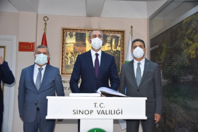 Boyabat ziyareti sonrası Sinop'a geçen Adalet Bakanı Abdulhamit Gül, Alaaddin Camii'nde cuma namazı kıldı. Ardından yürüyerek Sinop Valiliği'ne geçen ve Valilik Şeref Defteri'ni imzalayan Bakan Gül açıklamalarda bulundu. Sinop'a müjdeler veren Bakan Gül, "Sinop geliştikçe adliye anlamında da hizmetlerimiz yetersiz oluyor. Adliyemizi de genişletiyoruz. Yeni bir yerin tahsisini yaptık. Şu anda mevcut adliyenin 15 katı büyüklüğünde Sinop'umuza projesini yapmaya başladık bakanlık olarak. Valimiz, başsavcımız, milletvekilimize kadar takip ediyoruz. Güzel bir projeyle Sinop'umuzun bütün ihtiyacını karşılayacak ve onlarca yıl öteye de taşıyacak güzel bir adliyemizi inşallah kavuşturacağız. Tabii Sinop'umuz için de hayırlı olsun. Şu anda mevcutta çok tarihi bir binamız var. Gazi Mustafa Kemal Atatürk'ün de hatıralarının olduğu bu binamızı da maneviyatını, emanetini, tarihi siluetini koruyarak Sinop'umuza bir adliye kazandıracağız. Yine adliye ihtiyacı olan Gerze ve Durağan için de projelerini yaptık. O konuda da yatırım aşaması için Cumhurbaşkanlığı birimlerimizle görüşmelerimiz devam ediyor. Onu da yakında takip ediyoruz" diye konuştu.