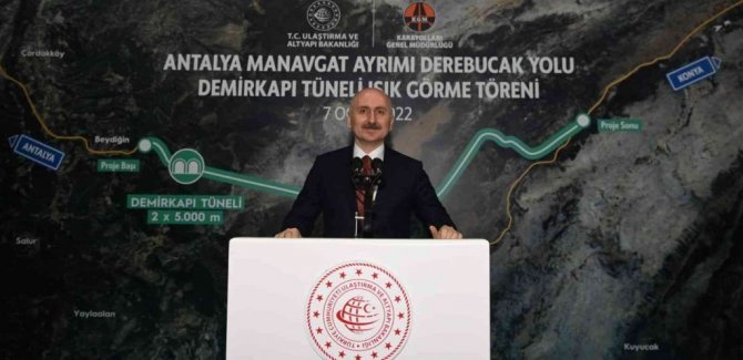 Antalya Demirkapı Tüneli Işık Görme Töreni'ne katılan Ulaştırma ve Altyapı Bakanı Adil Karaismailoğlu, burada yaptığı konuşmada, "Yapım çalışmaları devam eden Antalya-Manavgat ayrımı Taşağıl-İbradi ayrımı yolumuz üzerindeki Demirkapı Tüneli'nde kazı çalışmalarını tamamladık" dedi.
