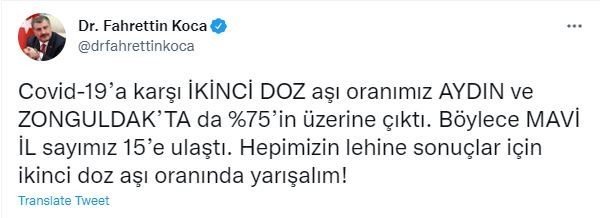Sosyal medya üzerinden yaptığı açıklamada herkesi aşı yarışına davet eden Bakan Koca, paylaşımında "Covid-19'a karşı ikinci doz aşı oranımız Aydın ve Zonguldak'ta da yüzde 75'in üzerine çıktı. Böylece mavi il sayımız 15'e ulaştı. Hepimizin lehine sonuçlar için ikinci doz aşı oranında yarışalım" ifadelerine yer verdi.