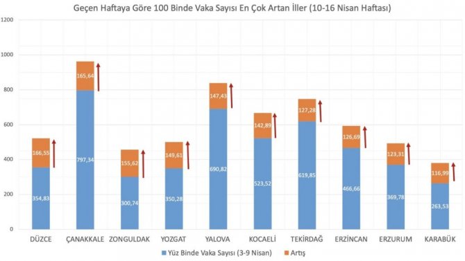 Sağlık Bakanı Fahrettin Koca, sosyal paylaşım sitesi Twitter üzerinden yaptığı paylaşımda, "100.000 nüfusa karşılık gelen haftalık vaka sayısı en çok artan illerimiz Düzce, Çanakkale, Zonguldak, Yozgat ve Yalova. Azalan illerimiz ise Kırklareli, Kilis, Samsun, Osmaniye ve Adıyaman. Vaka sayısı artış hızı azaldı. Vaka sayıları da tedbirlerle birlikte azalacak" ifadelerini kullandı.