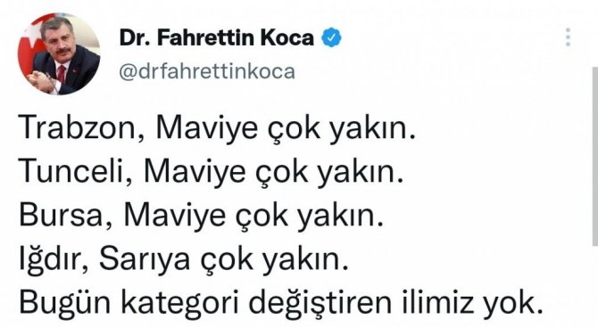 Sağlık Bakanı Koca, resmi twitter hesabında yaptığı paylaşımda kategori değiştiren herhangi bir il olmadığını ifade ederek Iğdır'ın sarıya yakın olduğunu belirtti. Bakan Koca, paylaşımında şu ifadelere yer verdi: "Trabzon, Maviye çok yakın. Tunceli, Maviye çok yakın. Bursa, Maviye çok yakın. Iğdır, Sarıya çok yakın. Bugün kategori değiştiren ilimiz yok."