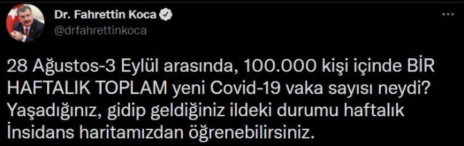 Sağlık Bakanı Fahrettin Koca, resmi Twitter hesabından, 28 Ağustos-3 Eylül arasında 100 bin kişi içinde bir haftada toplam yeni Covid-19 vaka sayısının yer aldığı haftalık İnsidans haritasının yer aldığı bir paylaşım yaptı.