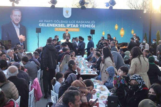 Ak Parti Gölbaşı İlçe Teşkilatı tarafından Atatürk Sahil Parkı'nda iftar programı gerçekleştirildi. İftar programına Çevre, Şehircilik ve İklim Değişikliği Bakanı Murat Kurum, Gölbaşı Belediye Başkanı Ramazan Şimşek, AK Parti Genel Sekreteri Fatih Şahin, AK Parti Ankara İl Başkanı Hakan Han Özcan, AK Parti Gölbaşı İlçe Başkanı Selim Akceylan katıldı. İftar sonrası konuşmasını gerçekleştiren Bakan Kurum, "Ankaralı dedelerimiz, "Ramazan'ın ruhu, sofrada misafir" demişler; "Ekmeği bölüş, kaderi paylaş." demişler. Hakikaten bugün Gölbaşı'nda Ramazan'ın ruhunu hissediyoruz. Muhabbetle dolup taşan bir atmosferin içindeyiz. İncelik gösterdiniz, bizleri davet ettiniz, misafir ettiniz, Allah hepinizden razı olsun. Şimdi oluşturduğunuz şu muhteşem manzaraya bakınca kendime şu soruyu bir kez daha sordum. "Bizi böyle bir kılan tılsım nedir? Bizi kardeş yapan dava nedir" Elbette, bu davanın adı büyük ve güçlü Türkiye davasıdır! Bu dava; Hakkâri'deki yavrumuzun kalem tutma davasıdır. Bu dava, Edirne'deki gencimizin savunma sanayinde destan yazma davasıdır. Bu dava yeryüzündeki tüm mazlumların sesi olma, sözü olma davasıdır. Bu dava, Gazi Başkentimiz Ankara'nın ekseninde 81 şehrimizi; ticarette, eğitimde, sanatta, bilimde, yeşilde, mavide ve şehircilikte en ileriye taşıma davasıdır" şeklinde konuştu.