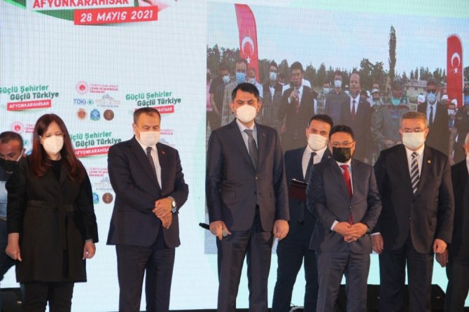 Afyonkarahisar'da ilk Millet Bahçelerini fidanla buluşturduklarını bildiren Bakan Kurum, "Afyonkarahisar hakikaten; doğal kaynaklarıyla, tarımsal üretim alanlarıyla, eşsiz doğasıyla, Frig vadisiyle muhteşem bir şehir. Bunun yanında; bugün Afyonkarahisar'ımıza çevrecilik açısından baktığımızda ne görüyoruz. Modern Atıksu Arıtma Tesisleriyle, İleri Biyolojik Arıtma Tesisiyle, Katı Atık Düzenli Depolama Tesisleriyle, Türkiye'nin en çevreci, en temiz, en yaşanabilir illerinin başında Afyonkarahisar geliyor. Ben tüm bu yüksek çevre hassasiyeti için, bu dev hizmetler için, Veysel Eroğlu hocamıza, ağabeyimize sizlerin huzurunda şükranlarımı sunuyorum. Yeni yapacağımız Millet Bahçeleri ve yeşil alanlarla şehrimizin bu güzelliğini güçlendireceğiz. Yeşil alan miktarımızı artıracak, sizler için yeni nefes alanları açacağız. Bugün Afyonkarahisar'a; yaklaşık maliyeti 150 milyon lira olan 6 Millet Bahçesi yapıyoruz. Bu 6 Millet Bahçesine yenilerini de ekleyerek; şehrimize, tam 1 milyon metrekare yeni yeşil alan kazandırma hedefimizi gerçekleştireceğiz. Bugün, eş zamanlı olarak; 270 bin metrekarelik Cirit Kayalığı Millet Bahçemizi, 125 bin metrekarelik Şuhut ve 50 bin metrekare büyüklüğündeki Sandıklı Millet Bahçelerimizi ilk fidanlarıyla buluşturuyoruz" dedi.