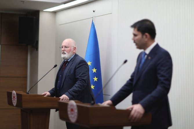 Çevre, Şehircilik ve İklim Değişikliği Bakanı Murat Kurum ile AB Komisyonu Kıdemli Başkan Yardımcısı Frans Timmermans ve beraberindeki heyet, bakanlıkta düzenlenen "AB Yüksek Düzeyli Diyalog Toplantısı"nda bir araya geldi. 1 saate yakın süren toplantı sonrası Bakan Kurum ve Timmermans ortak basın toplantısı düzenledi. Bakan Kurum, toplantıda Türkiye'nin iklim değişikliği ile yapmış olduğu mücadeleyi, gelecek süreçte atacağı adımları, Avrupa Birliği ile birlikte bir uyum içerisinde karşılıklı sağlayacakları destekleri detaylı bir şekilde görüşme fırsatı bulduklarını söyledi.