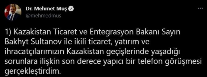 Ticaret Bakanı Mehmet Muş, sosyal medya hesabından, Kazakistan Ticaret ve Entegrasyon Bakanı Bakhyt Sultanov ile yapıcı bir telefon görüşmesi gerçekleştirdiğini paylaştı. Muş ve Sultanov'un görülmesinde ikili ticaret, yatırım ve Türk ihracatçıların Kazakistan geçişlerinde yaşadığı sorunlara ilişkin konular ele alındı.