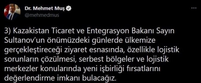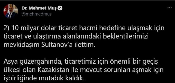 Bakan Muş paylaşımında, Türkiye ile Kazakistan arasındaki 10 milyar dolar ticaret hacmi hedefine ulaşmk için ticaret ve ulaştırma alanlarındaki beklentilerini mevkidaşı Sultanov'a ilettiğini belirtti. Muş, Asya güzergahında, Türkiye'nin ticareti için önemli bir geçiş ülkesi olan Kazakistan ile mevcut sorunları aşmak için işbirliği konusunda mutabık kaldıklarını bildirdi.