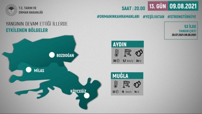 Bakanın paylaşımına göre, orman yangınlarının 13'üncü gününde Muğla'nın Köyceğiz ve Milas ilçesi ile Aydın'ın Bozdoğan ilçesindeki orman yangınlarını kontrol altına alma çalışması sürüyor. Yangınlara, 15 uçak, 64 helikopter, 9 İHA, 1 insansız helikopter, 850 arazöz, 430 iş makinesi ve 5 bin 250 personel ile müdahale ediliyor.