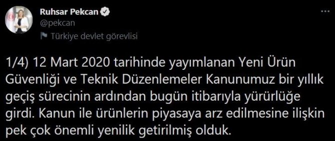 Ticaret Bakanı Ruhsar Pekcan, resmi sosyal medya hesabı üzerinden Yeni Ürün Güvenliği ve Teknik Düzenlemeler kanunun yürürlüğe girdiğini bildirdi. Pekcan, "2 Mart 2020 tarihinde yayımlanan Yeni Ürün Güvenliği ve Teknik Düzenlemeler Kanunumuz bir yıllık geçiş sürecinin ardından bugün itibarıyla yürürlüğe girdi. Kanun ile ürünlerin piyasaya arz edilmesine ilişkin pek çok önemli yenilik getirilmiş olduk" ifadelerini kullandı.