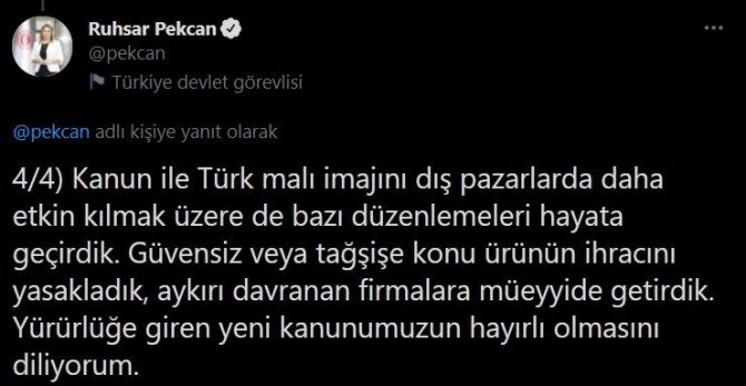 Pekcan ayrıca, kanun ile Türk malı imajını dış pazarlarda daha etkin kılmak üzere de bazı düzenlemeleri hayata geçirdiklerini vurgulayarak, "Güvensiz veya tağşişe konu ürünün ihracını yasakladık, aykırı davranan firmalara müeyyide getirdik. Yürürlüğe giren yeni kanunumuzun hayırlı olmasını diliyorum" aktarımında bulundu.