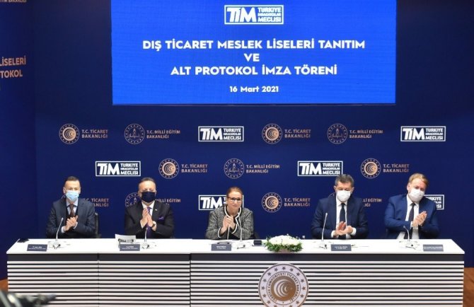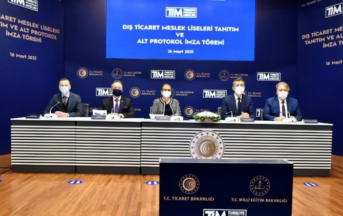 Milli Eğitim Bakanlığı, Ticaret Bakanlığı ve Türkiye İhracatçılar Birliği arasında Dış Ticaret Meslek Liseleri Ortak Protokol'ü imzalandı. Ticaret Bakanlığı binasında düzenlenen törene Milli Eğitim Bakanı Ziya Selçuk, Ticaret Bakanı Ruhsar Pekcan ve Türkiye İhracatçılar Meclisi Başkanı İsmail Gülle katıldı. Programda konuşan Bakan Selçuk, "Ticaret Bakanlığı ve Türkiye İhracatçılar Meclisi (TİM) ile dış ticareti geliştirmek için, nitelikli iş gücünün yetiştirilmesi konusunda bir iş birliği oluşturmak üzere bir araya gelmek bulunuyoruz. Amacımız ülkemizin müreffeh yarınlarına katkı sağlayacağına inandığımız, ihracatın niceliğine ve niteliğine yetişmiş iş gücüyle katkı sunmak. Mesleki ve teknik eğitimde sektörün iş gücü ihtiyacına cevap verebilecek alana sahip, gelişen teknolojilere hızlı ve etkin şekilde uyum sağlayabilen, paydaşların planlama ve karar alma süreçlerine aktif şekilde katılabilen yetiştirebilecek bir yapıyı tamamlamak üzere 2023 eğitim vizyonu ilkelerimiz doğrultusunda çalışmalarımızı sürdürüyoruz. Bu noktada iş dünyasının deneyimlerinden kaynaklarından yararlanmayı, onlarla sahip oldukları gücü birleştirmeyi önemsiyoruz. İhtiyaç ve talepleri karşılayacak adımları atmaya devam etmek, bu köprüyü işler ve sağlam kılmak istiyoruz. Bu çerçevede mesleki faaliyetlerimizi sektörün ihtiyacı neyse bizim müfredatımızın önemli kısmı odur şekilde ifade edeceğimiz bir anlayışla yeni bir dönemi de başlattık" dedi.