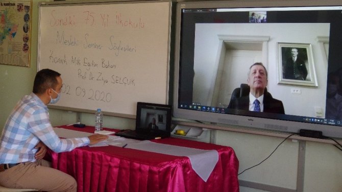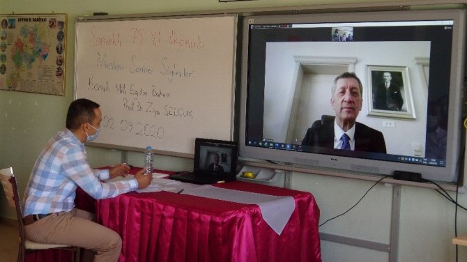 Afyonkarahisar’ın Sandıklı ilçesinde 75. Yıl İlkokulu tarafından yürütülen ‘Mesleki Eğitim Çalışmaları’na Milli Eğitim Bakanı Ziya Selçuk telekonferans sistemi ile katıldı. Okul Müdürü Mehmet Gönen ve Müdür Yardımcısı Mehmet Yılmaz önderliğinde bir araya gelen okul öğretmenleri ‘Mesleki Seminer Söyleşileri’ kapsamında okula telekonferans ile bağlanan Bakan Selçuk çalışmalar hakkında bilgiler aldı. Telekonferans sistemi üzerinden öğretmenlere seslene Bakan Selçuk, “189 bin eğitimci arkadaşımız ile yüz yüze konuşma fırsatı bulduk, önemli olan sizlerden problemleri duymak. Yaptığınız başarıları dinlemek. Çok ayrı bir hisse sahip oluyoruz. Emekleriniz için çok teşekkür ediyorum. 20-30 yıllık öğretmen arkadaşlarımıza sorun. Biz bu pandemi döneminde farklı bir şey yapmaya çalışıyoruz. 30 sene çalışan bir öğretmen bir kere bile Milli Eğitim Bakanı ile karşılaşmaya bilir. Bu salgın sürecinde bizim meselemiz şu. Kulaktan kulağa duyma ile değil birbirimize ulaşarak, yüz yüze görüşerek halimiz ile hallenerek beraber iş yapmak. Öğrenci velilerimize ve ailelerinize selamlarımı söyleyin. Allah yolunuzu açık etsin. Bir ihtiyacınız olduğu zaman her zaman haberleşiriz” dedi.
