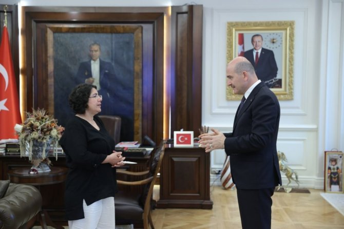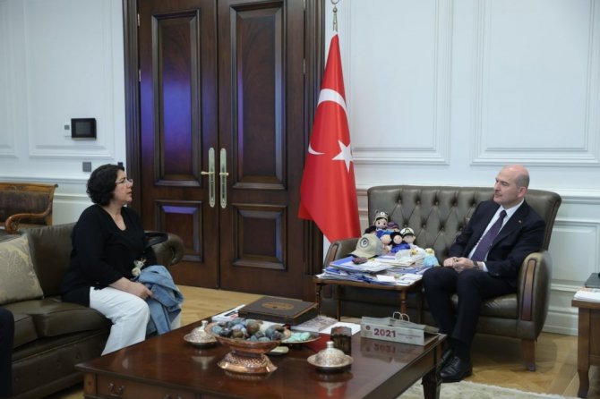 İçişleri Bakanı Süleyman Soylu, Almanya'da terör örgütü PKK/KCK tarafından kaçırılan ailelerin sesi olarak 92 hafta önce evlat nöbetini başlatan Maide Töremiş Aktaş'ı makamında kabul etti.