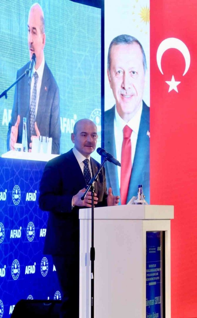 Bakan Soylu, afet yönetiminde AFAD'ın çatı kurum olduğunun altını çizerek, "27 bin 812 deprem toplanma alanımız, 413 bin gönüllümüz, il risk azaltma planlarımız, afete yönelik dijital altyapılarımız, AYDES adını verdiğimiz afet yönetimi ve karar destek sistemimiz, Aras adını verdiğimiz afet risk azaltma sistemimiz, Tasip adını verdiğimiz Türkiye afet sonrası iyileştirme planımız, lojistik depolarımız, destek depolarımız, çalışma gruplarımız, koordine olmuş sivil toplum ve kamu kuruluşlarımız, AFAD haricinde akredite edilmiş arama kurtarma ekiplerimiz gibi pek çok bileşenle küresel ölçekte başarılı yönetimi, koordinasyonu yüksek olan bir yönetim ortaya koyuyoruz" şeklinde konuştu.