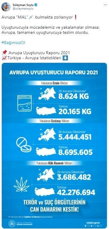 İçişleri Bakanı Soylu, sosyal medya hesabından 2021 yılında Avrupa'da ve Türkiye'de ele geçirilen çeşitli uyuşturucu maddelerinin sayılarının yer aldığı "Avrupa Uyuşturucu Raporu 2021" isimli bir tablo paylaştı. Türkiye'nin uyuşturucu ile verdiği mücadelenin Avrupa ülkelerinden daha fazla olduğunu vurgulayan Bakan Soylu paylaşımında, "Avrupa "mal" bulmakta zorlanıyor. Uyuşturucuyla mücadelemiz ve yakalamalar olmasa Avrupa tamamen uyuşturucuya teslim olurdu" ifadelerini kullandı.