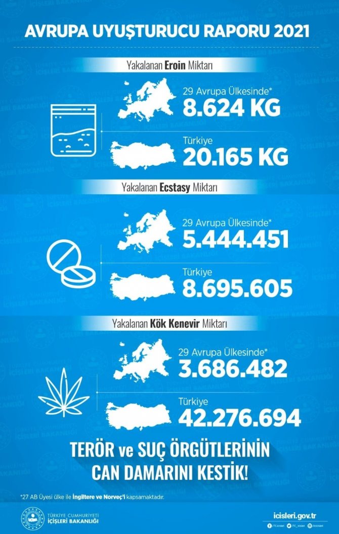 Bakan Soylu'nun paylaştığı tabloda Türkiye'de ve Avrupa'da 2021 yılında ele geçirilen uyuşturucu maddelerin miktar ve sayıları yer aldı. Söz konusu tabloya göre Avrupa'da ele geçirilen eroin miktarının 8 bin 624 kilogram olduğu, Türkiye'de ise bu sayının 20 bin 165 kilogram olduğu belirtildi. Raporda, yakalanan ecstasy miktarının Avrupa'da 5 milyon 444 bin 451 olduğu kaydedilirken, Türkiye'de 8 milyon 695 bin 605 ecstasy yakalandığı bilgisi verildi. Kök kenevirde ise Avrupa ülkelerinde 3 milyon 686 bin 428 olan sayının Türkiye'de 42 milyon 276 bin 694 olduğu kaydedildi. Tabloda ayrıca, "Terör ve suç örgütlerinin can damarını kestik" ifadelerine yer verildi.