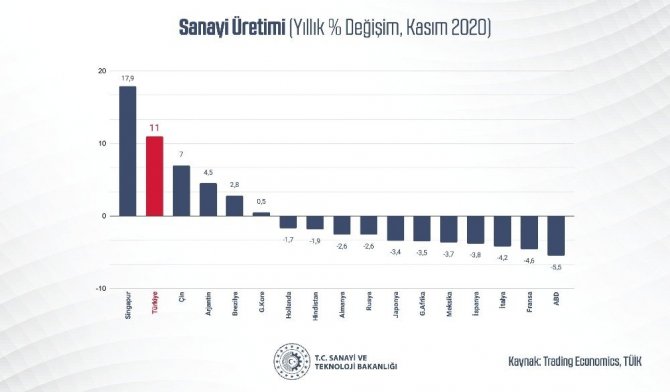 Sanayi ve Teknoloji Bakanı Mustafa Varank, "Yaşanan tüm zorluklara rağmen sanayi üretimimiz yıllık yüzde 11, aylık ise yüzde 1,3 artışla piyasa beklentilerinin...