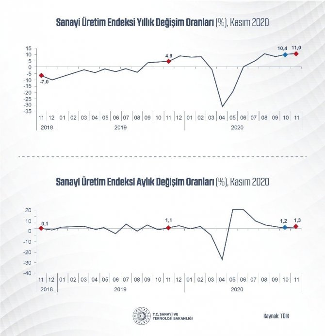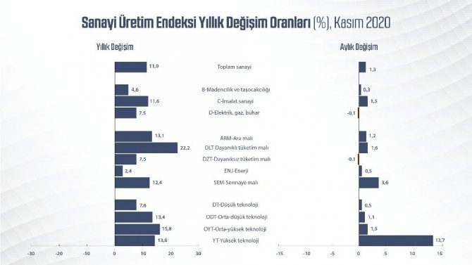 Sanayi ve Teknoloji Bakanı Varank, kasım ayı Sanayi Üretim Endeksi'ne ilişkin açıklamada bulundu. Varank, sanayi üretiminin kasım ayında piyasa beklentilerinin üstünde artarak devam ettiğini ifade ederek, "Yıllık yüzde 11 artış gösteren Sanayi Üretim Endeksi bir önceki aya göre de yüzde 1,3 arttı. Mevsim ve takvim etkilerinden arındırılmış seriye göre Kasım 2020 itibarıyla Ocak 2018'den bugüne en yüksek yıllık değişim oranına ulaştık. Sanayi üretimindeki yükselişi sürükleyen en önemli faktörlerden birinin aylık yüzde 13,7'lik artışla yüksek teknoloji ürünlerinin olması oldukça önemli. Son dönemde başlattığımız yüksek teknoloji yatırım hamleleriyle bu artışı kalıcı hale getirmek temel önceliğimiz. Sağlıklı, sürdürülebilir ve kalıcı büyüme için yüksek katma değerli üretimi desteklemeye devam edeceğiz. Pandemi sürecinde global talep artışı yaşanan dayanaklı tüketim mallarının üretimi, kasım ayında yıllık yüzde 22,2 artarak ihracatımıza da ciddi bir katkı sağladı. Diğer taraftan sermaye malları üretiminde bir önceki aya göre yaşanan yüzde 3,6'lık güçlü artış, yatırım iştahının önümüzdeki dönemde de devam edeceğine işaret ediyor. Sanayi sektöründeki çeşitlendirme ve olağanüstü durumlara adaptasyon kabiliyeti Türkiye'yi diğer ülkelerden olumlu yönde ayrıştırmıştır. Tüm dünyada ekonomilerin tarihi daralmalar yaşadığı bir dönemde sanayimizin salgına rağmen gösterdiği bu başarı takdire şayandır. Büyümenin öncü göstergelerinden olan Sanayi Üretim Endeksi'nde ekim ve kasım aylarında gerçekleşen artış, yılın son çeyreğini güçlü, 2020 yılını ise pandemi şartlarına rağmen pozitif büyümeyle tamamlayacağımıza işaret ediyor" dedi.