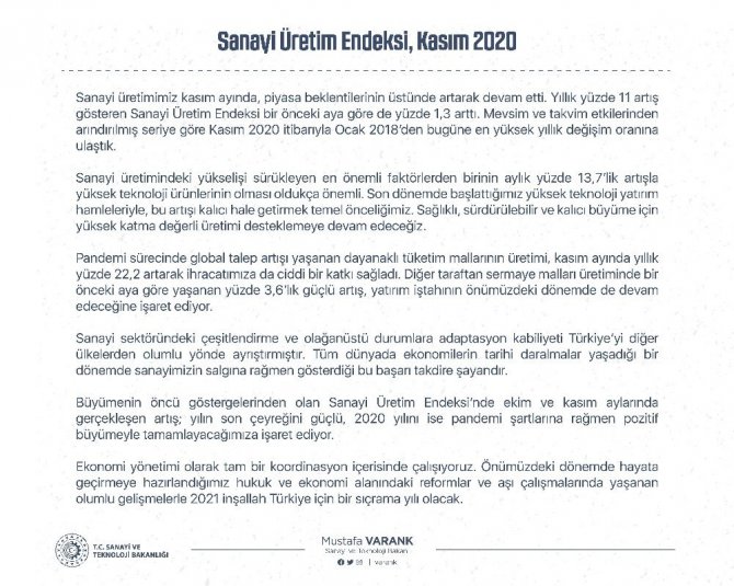 Sanayi ve Teknoloji Bakanı Mustafa Varank, "Yaşanan tüm zorluklara rağmen sanayi üretimimiz yıllık yüzde 11, aylık ise yüzde 1,3 artışla piyasa beklentilerinin üzerinde gerçekleşti" dedi.