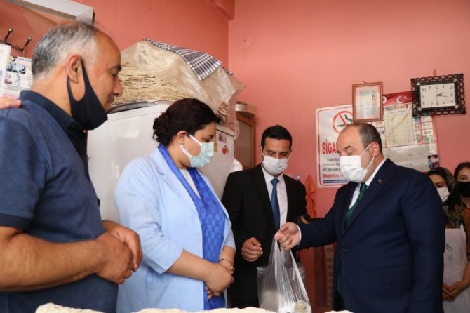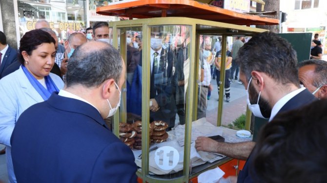 KIRŞEHİR (İHA) – Sanayi ve Teknoloji Bakanı Mustafa Varank, Kırşehir temasları kapsamında Kırşehir Valiliğini ziyaret ettikten sonra kendisini takip eden kamu personeline dondurma dağıtırken, Ahi esnafından da alışveriş yaptı.