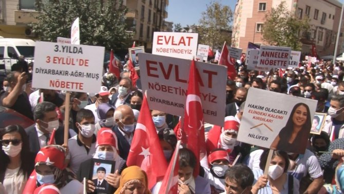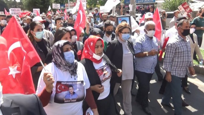 Diyarbakır'da çocukları terör örgütü tarafından kaçırılan ailelerin eylemi 3. yılına girerken, HDP il binası önünde sabah saatlerinde çok sayıda vatandaş toplandı. Aileler ve vatandaşlar tarafından burada HDP il binası kapısına Türk bayrağı asıldı. Yürüyüşe katılan Aile ve Sosyal Hizmetler Bakanı Derya Yanık, "Kürt haklarını koruduklarını söyleyen özellikle son 35 yıldır 87'den beri aralıksız terör faaliyetini gerçekleştiren örgüt aslında ilk eylemlerini de bu bölgeden başlattı. Yani haklarını savunduğunu iddia ettiği insanları öldürerek başlıyor. İnsanları katlederek, bebekleri, hamile kadınları öldürerek başlıyor" dedi.