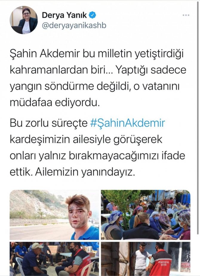 Aile ve Sosyal Hizmetler Bakanı Derya Yanık, Marmaris'te yangın söndürme ekiplerine gönüllü olarak motoruyla su taşırken dumandan etkilenerek hayatını kaybeden 25 yaşındaki Şahin Akdemir'in ailesini arayarak başsağlığı diledi.